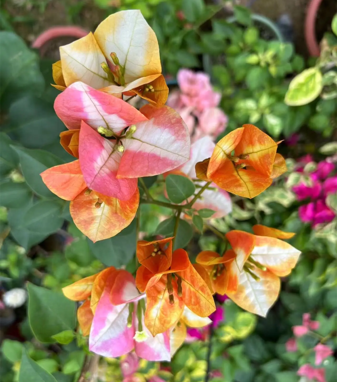 Orange ice is also called golden spot orange, It is also a kind of bougainvillea, It is definitely a face value player in the bougainvillea family. Bracts are bright orange at first, then turn orange-pink; The new young leaves are reddish-brown with copper-colored edges, and with growth, the leaves turn green with edges Golden yellow and There are often small gray spots between golden and green, which are very characteristic.