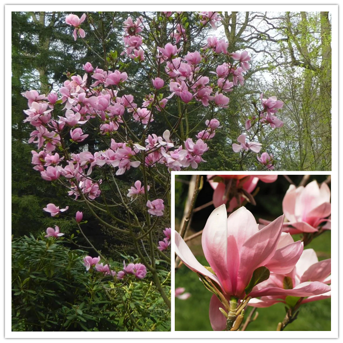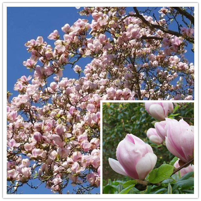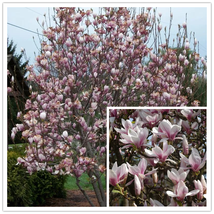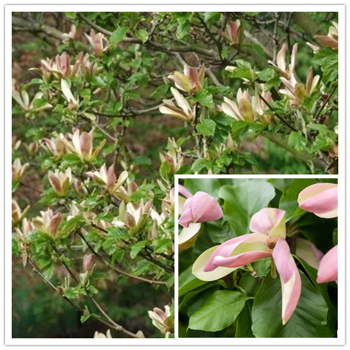 Magnolia “Blush Beauty” is “Yellow Bird” And “Karl Hayes Beauty ” A hybrid of (Plant height about 6-6.7 m) , the flower diameter is 20-30 cm, it does not have a trace of “yellow bird” yellow, only “Karl Hayes” Beauty “powder (The petals are dark pink on the outside and light pink on the inside) , the petals are narrower and the plants are more cold-resistant.