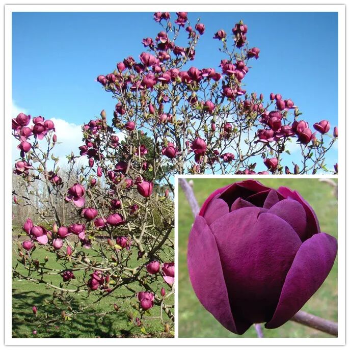 Magnolia “Black Beauty” has a height of up to 9 m, with tulip-shaped flowers and dark purple petals (almost black) Of, the interior is cream colored, which is very unique.