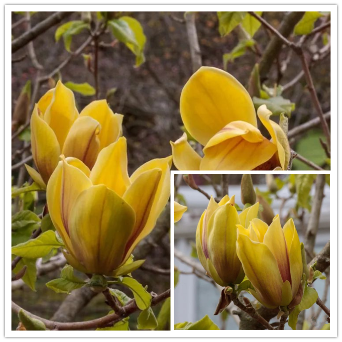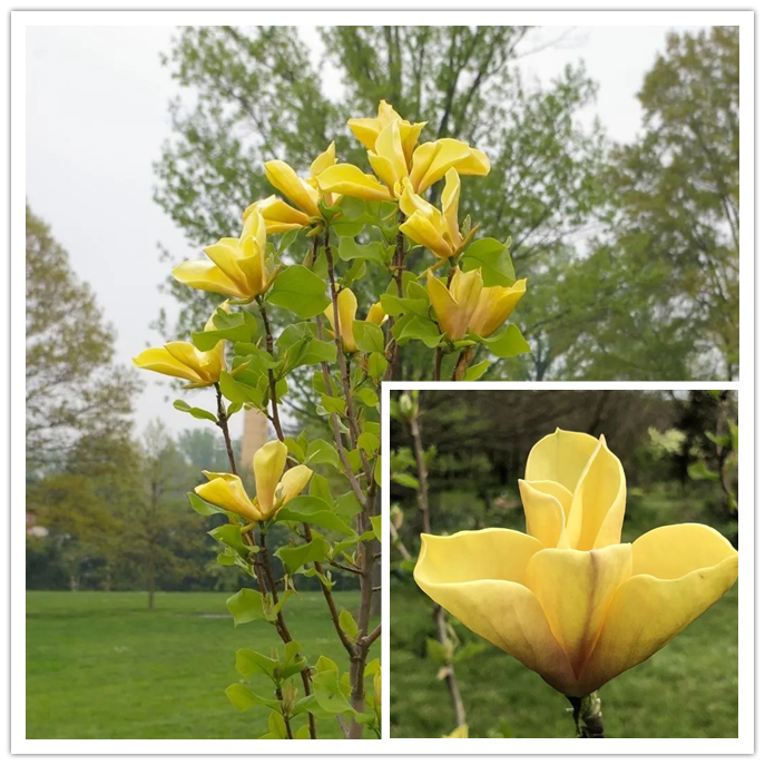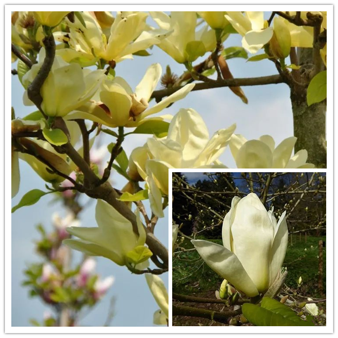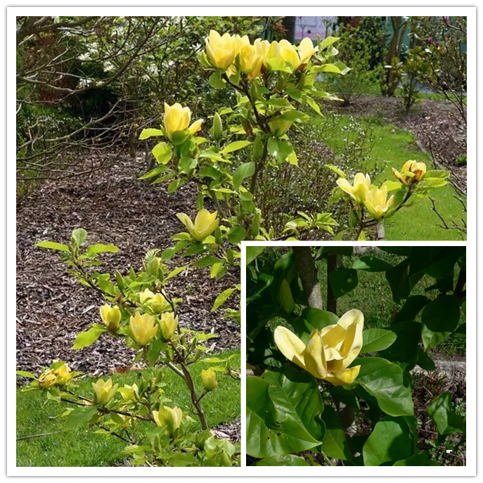 Magnolia “Yellow Bird” plants can reach 12 m high, with cup-shaped flowers and yellow flowers.
