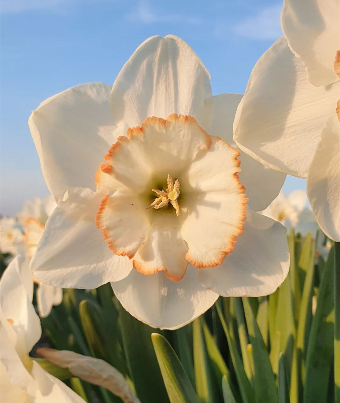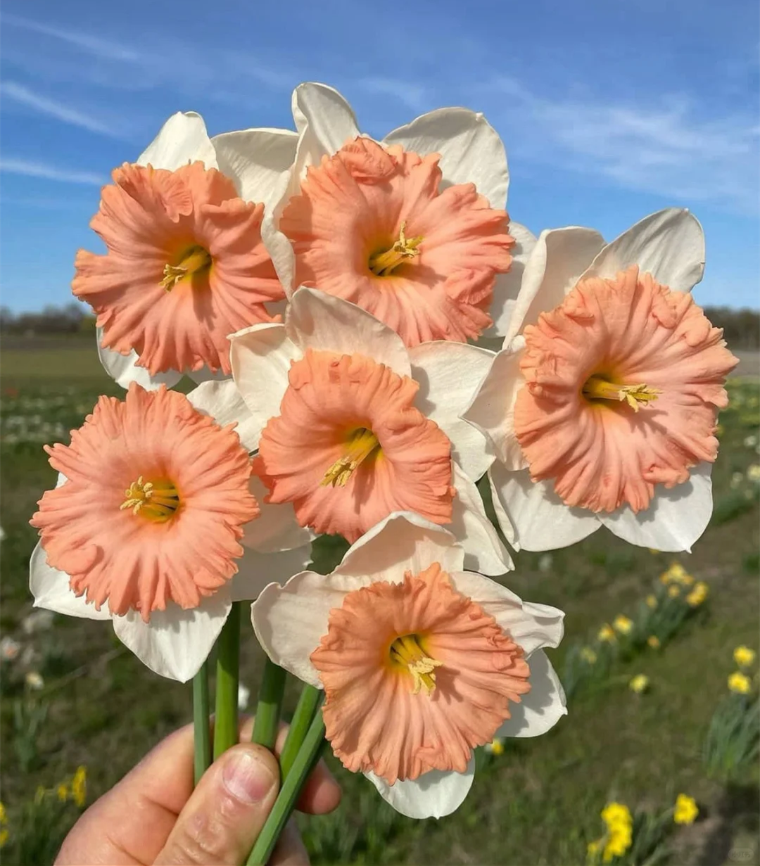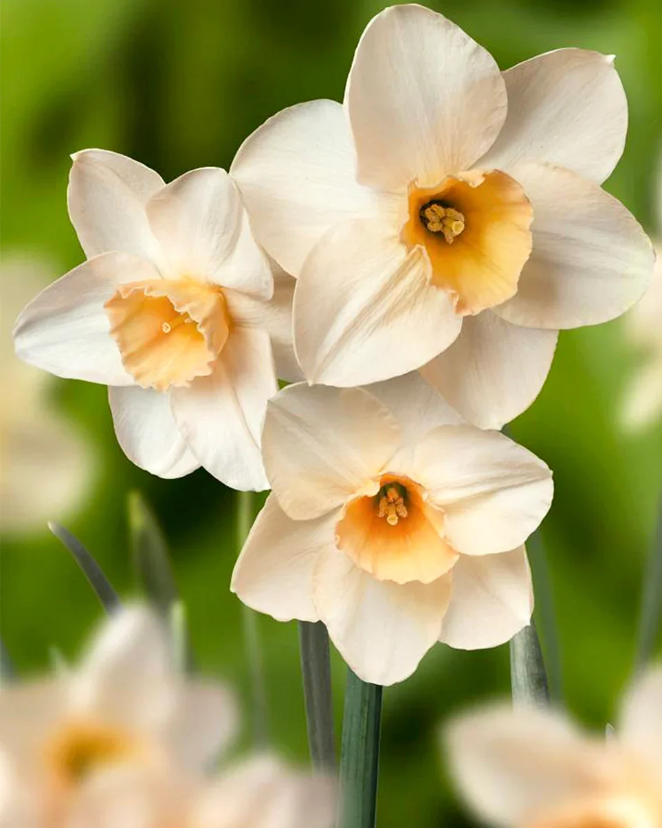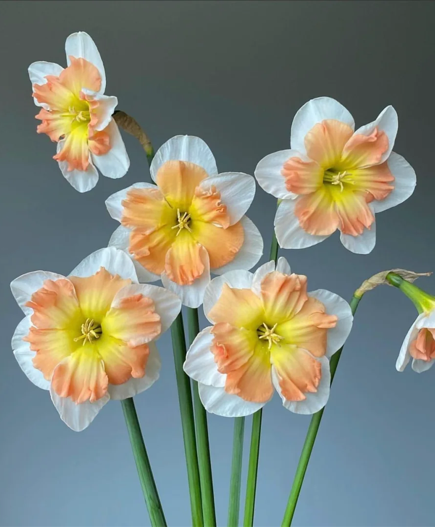 Sparkling wine is a clove narcissus. The petals are milky white at first, and gradually turn into light apricot color in the later stage. The creamy yellow corolla has fine folds and light orange lace.