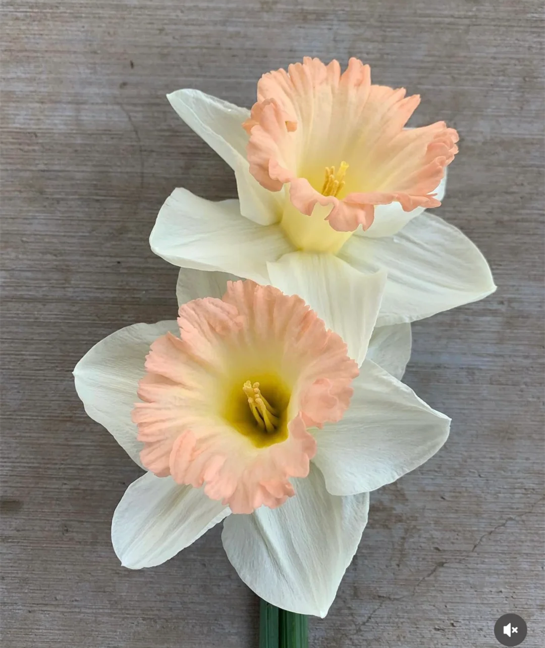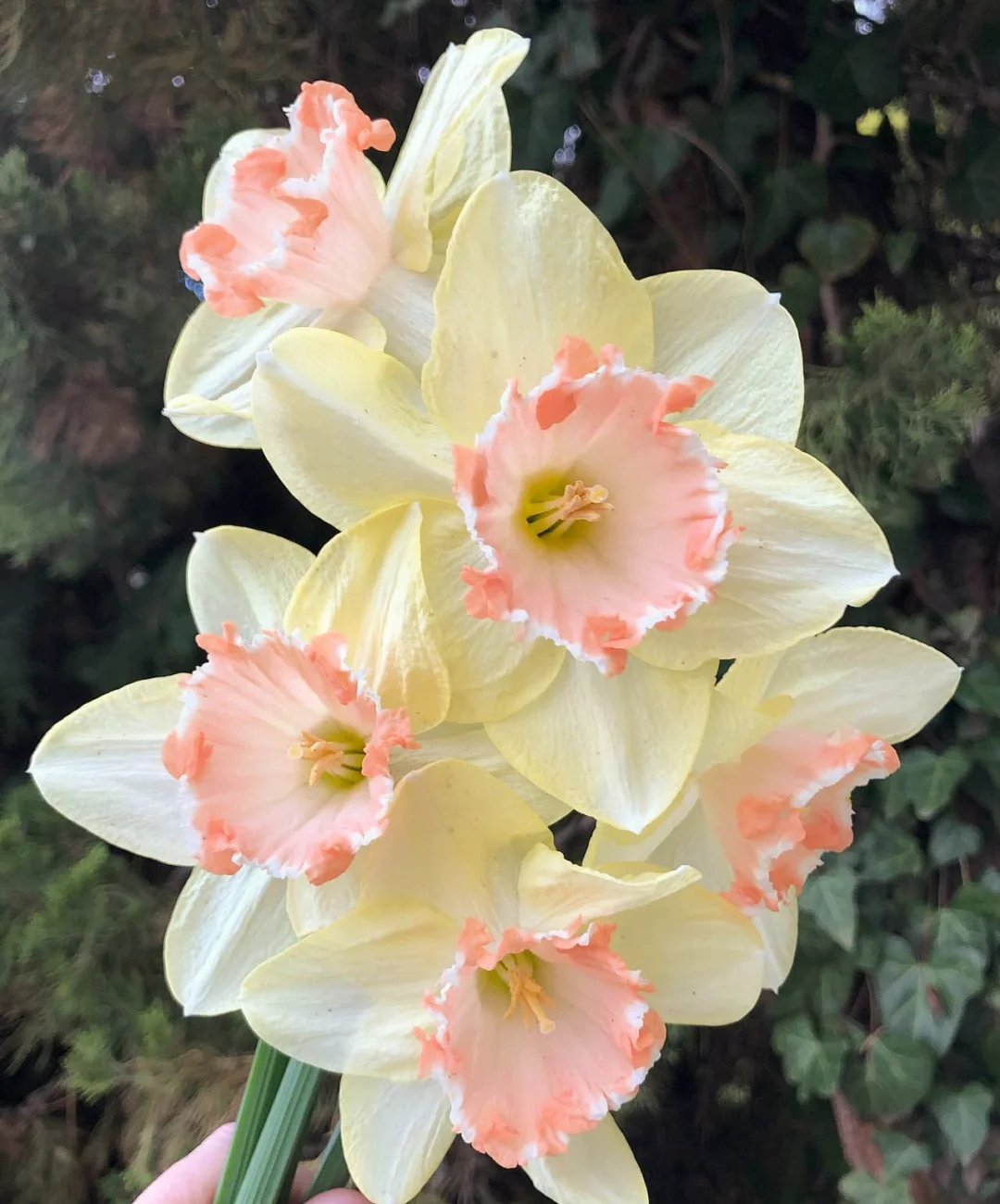 Oops, it is a large narcissus with yellow petals and salmon-colored corolla with jagged white lace. The color and shape of the flower are very special.