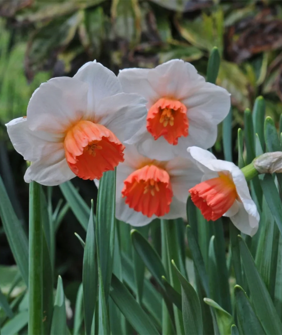 Barracuda Smile is a split-crowned narcissus with pure white petals and a salmon-colored corolla with broken feathers.