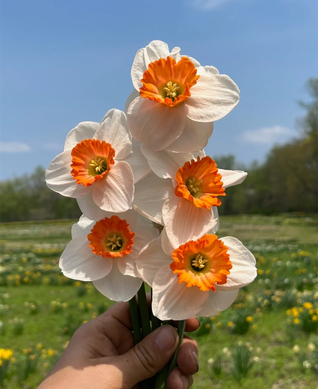 Slim Whitman, also known as the Orange Ice Show, is a large narcissus with pure white petals and a folded corolla that is orange at first and gradually turns milky (redness at central site) 。
