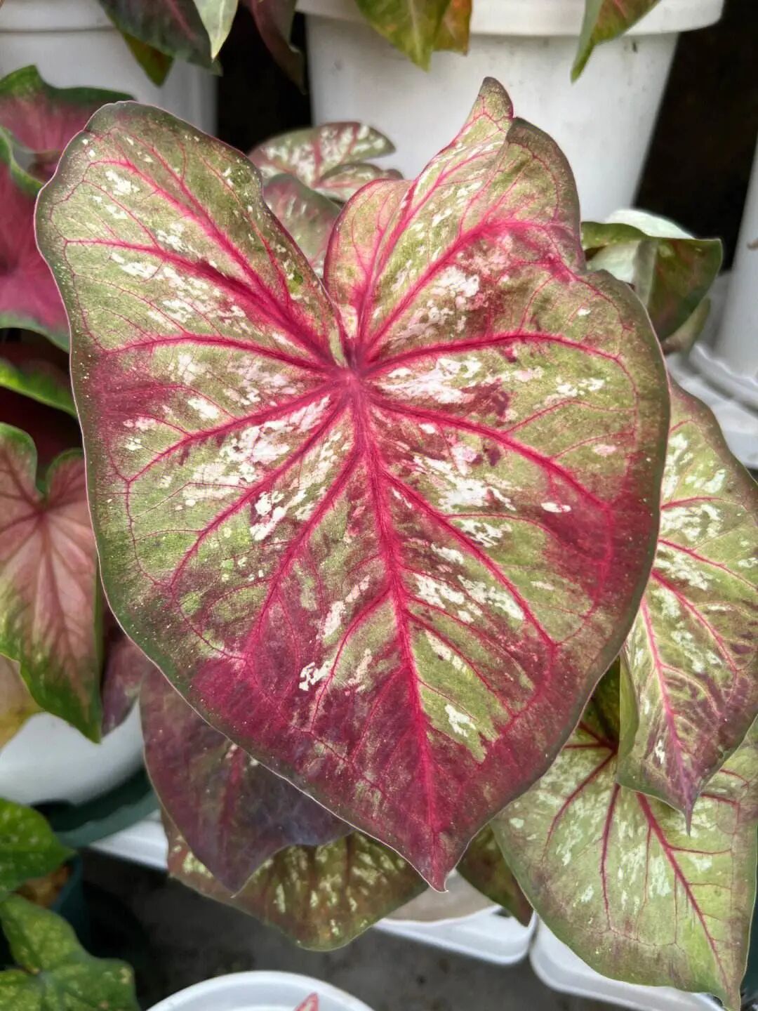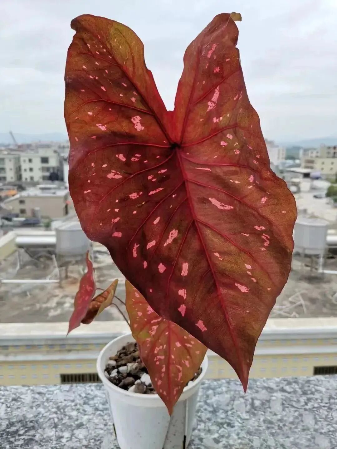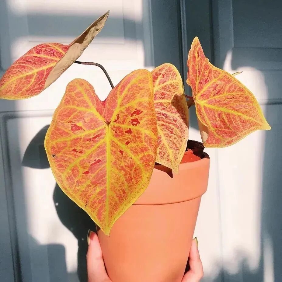 A relatively rare colorful taro, the leaves are fancy red, which is mixed and matched by green, yellow-green and orange-red, forming a strong color contrast.