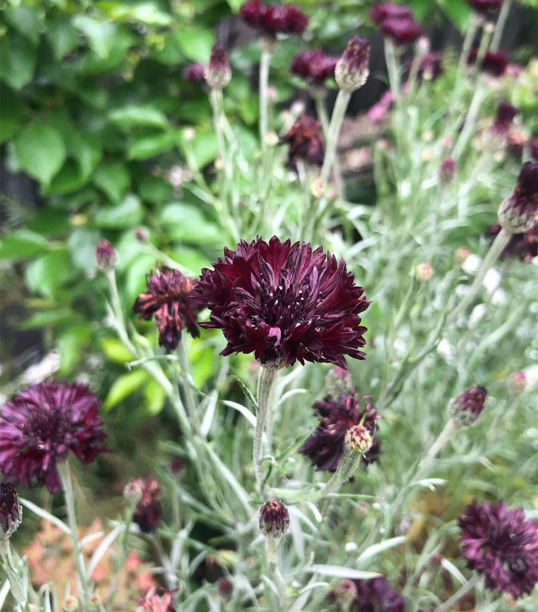 The “black ball” cornflower has a dark red color that is nearly black, Semi-double petal Presents a tubular bloom with five lobes at the top, Ingenious Dark color The flowers are in very sharp contrast with the “silver leaves” with silver hairs and are full of personality.