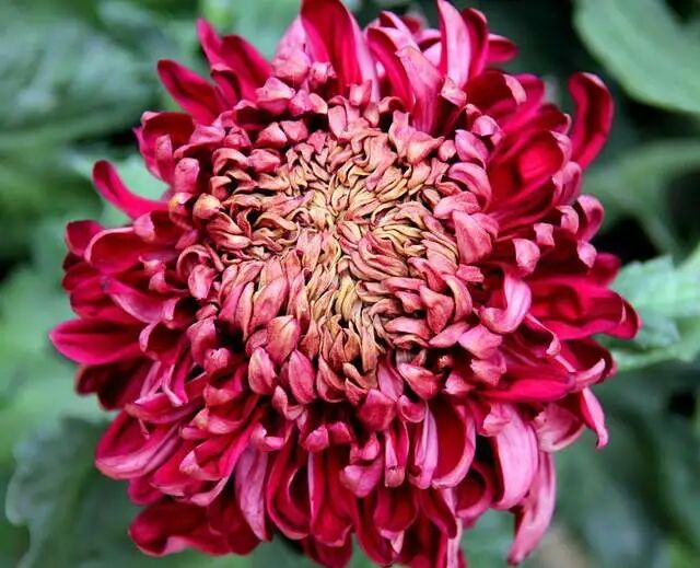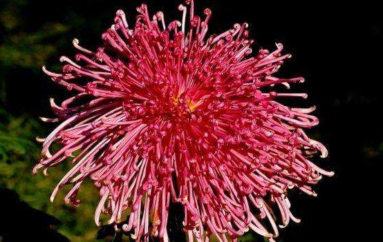 Chrysanthemum is lotus-shaped at the beginning of flowering, and reverse-rolled at the full flowering stage. The petals are thin, the color is black and red, shiny and velvety, and there is a tube-shaped flower in the center of the flower.
