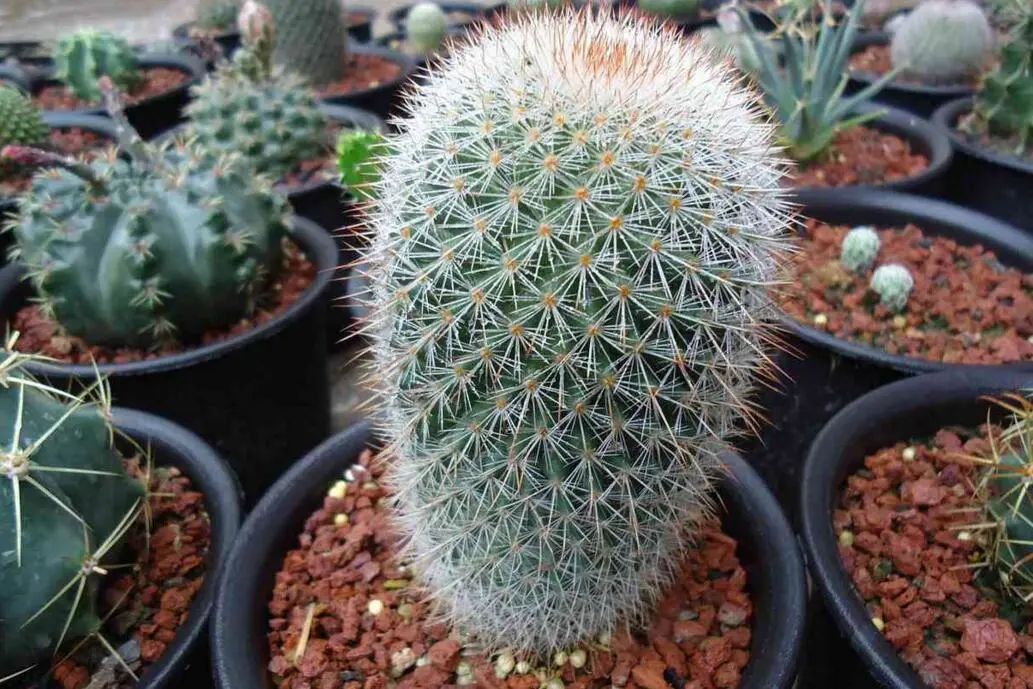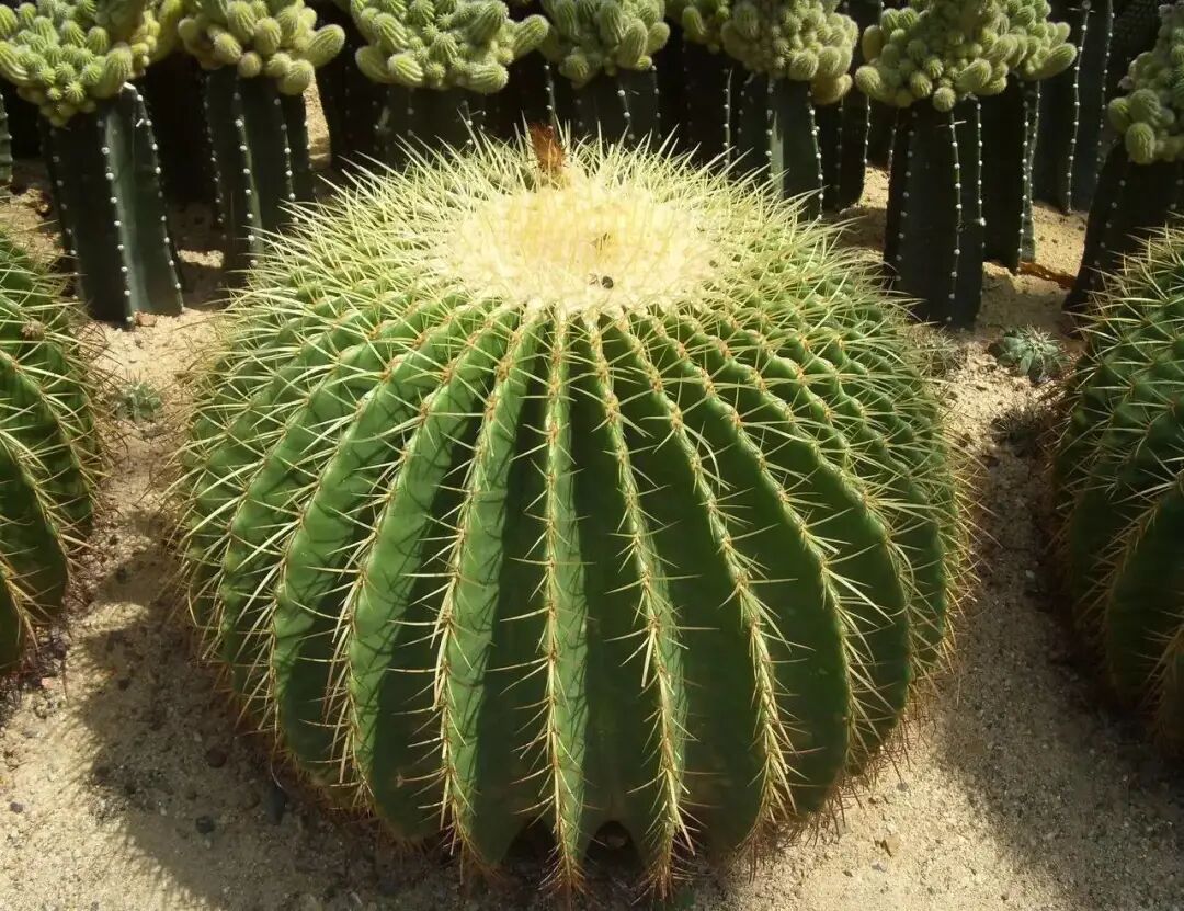 Naked hunk, also known as short-thorned golden hunk and thornless golden hunk, is similar in shape to golden hunk, but there are no thorns or short blunt thorns, and the top of the sphere has pale yellow fluff.