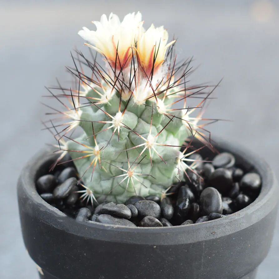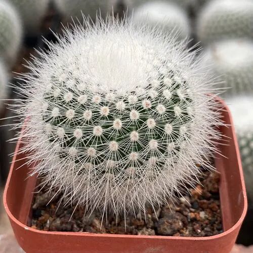 The sphere of Shirakomachi is dark green, and the thorn seats are densely distributed. Each thorn seat has a middle thorn and silver-white or yellow-white brush-shaped secondary thorn.