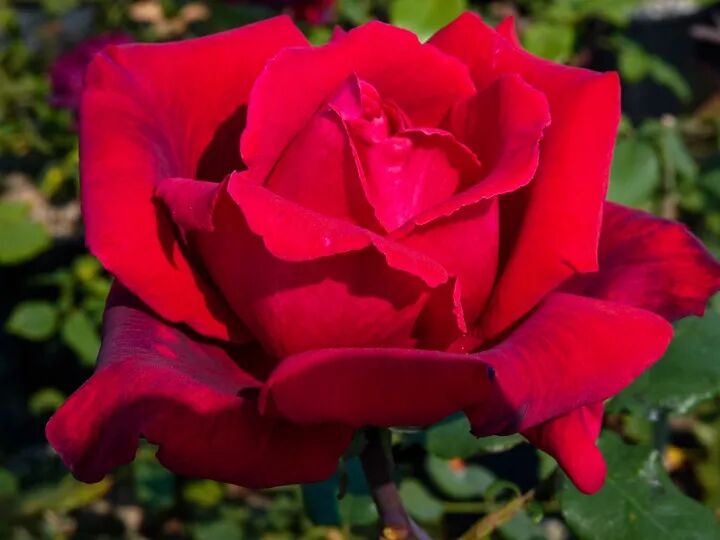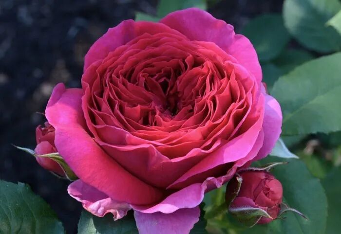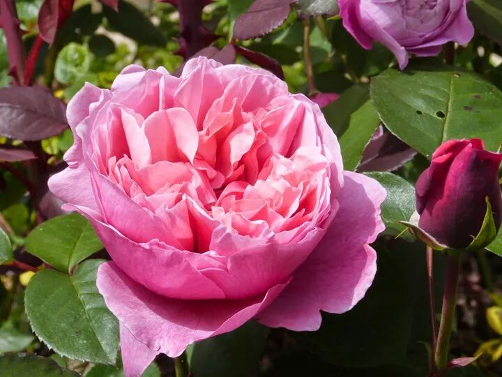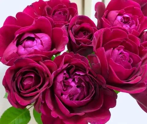Flower diameter 10 cm, double petals (40-60 petals), purple red, rich fruity and violet fragrance, repeated flowering in many seasons. The plant is about 70-90 cm tall.