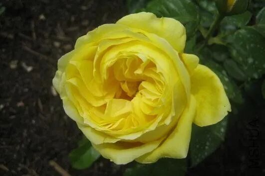 Flower diameter 12-13 cm, double petals (40 petals), yellow, light tea fragrance, repeated blooming in many seasons. The plant is about 100 cm tall.