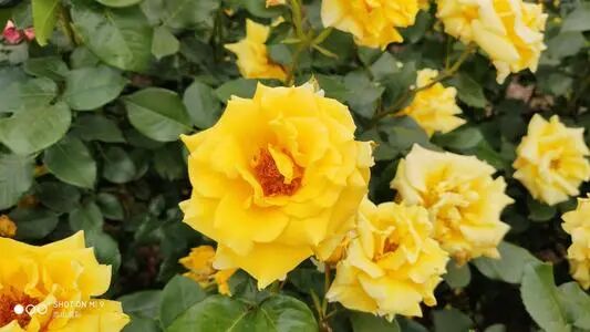 Features: Large flowers, frequent flowers, rich and gorgeous colors (light yellow petals with red halo), high-center curled flower shape, dense branches and leaves, and thin branches.