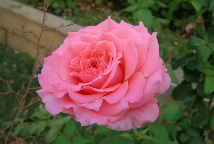 Flower diameter 10 cm, double petals (30 petals), pink, fruity fragrance, repeated flowering in many seasons. The plant is about 100 cm tall.
