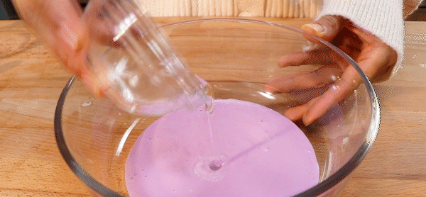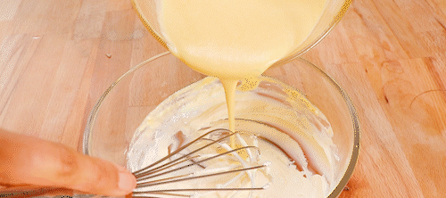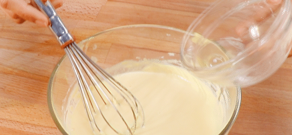 6. Add the mixed liquid in a small amount and many times to the softened cream cheese, and stir evenly with egg pump.