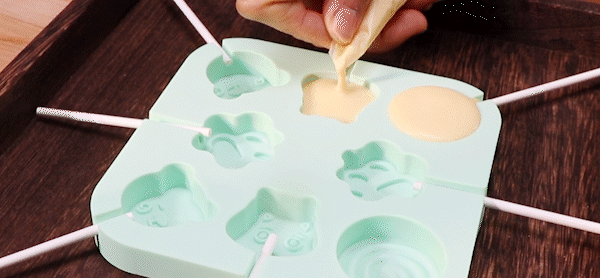 4. Pour the cheese paste into a piping bag or a container with a guide nozzle, put the paper stick on a silicone mold, don’t put it too much in, squeeze the cheese paste, and then push the paper stick inside. (Same operation as pumpkin)