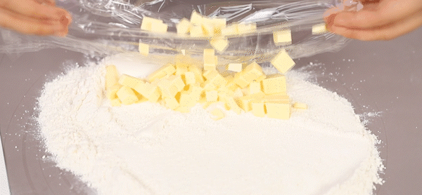 4. Take out the butter from the refrigerator and cut it into small pieces (be sure to use cold butter, which is the key to delicious shortbread), Then add the butter to the well mixed dough and cut with a spatula to mix well.