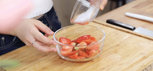 1. Wash, pedicle and slice strawberries. Put in 55 g sugar, stir well, and put in the refrigerator to chill (2 hours is best)